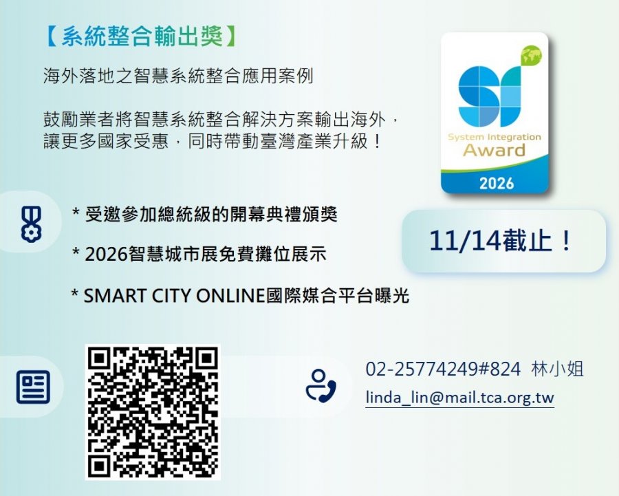 | 【報名截止日提醒】2026系統整合輸出獎,徵件截止日止到11/14,已在海外輸出落地的廠商不要錯過! | 2025-10-21 |