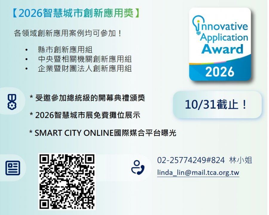 | 【報名截止日提醒】2026智慧城市創新應用獎,徵件截止日止到10/31,歡迎踴躍參賽! | 2025-10-21 |