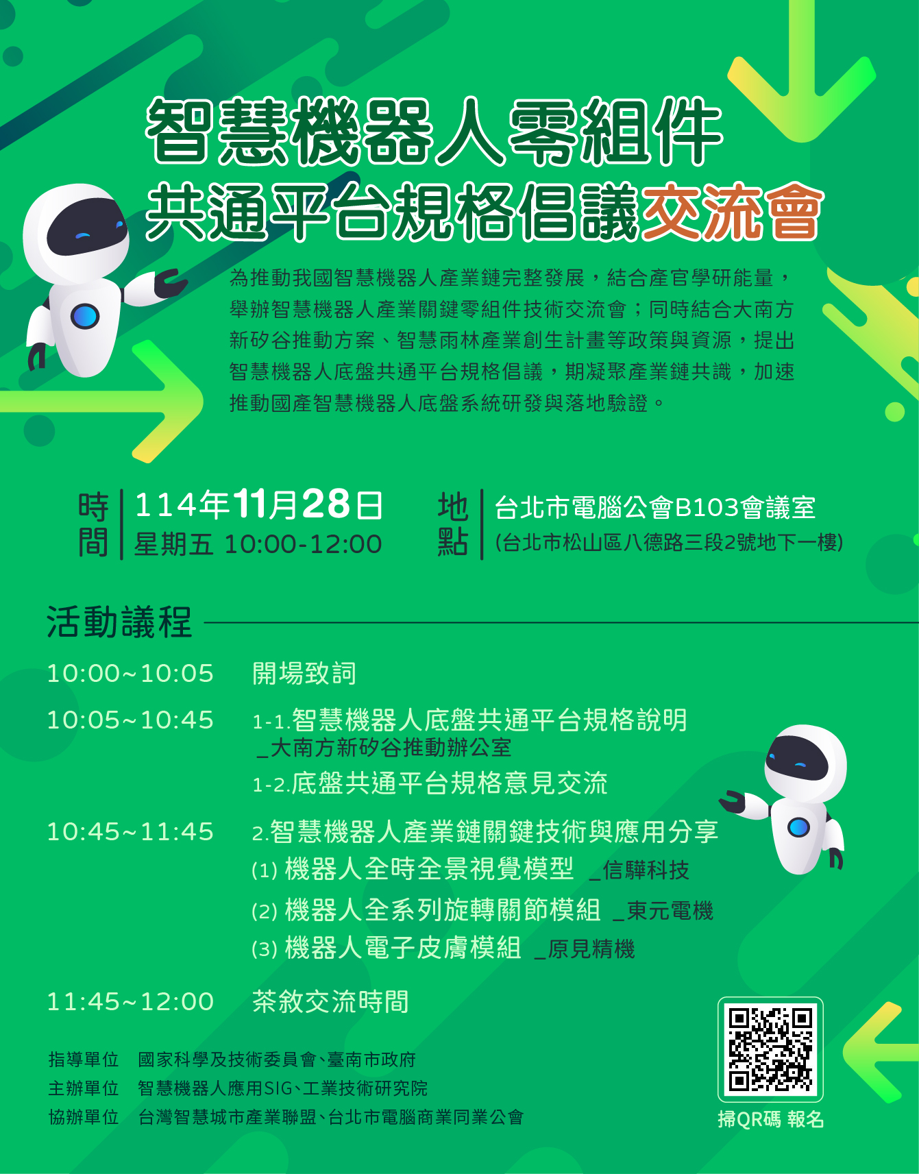 | 【活動延期公告】智慧機器人零組件共通平台規格倡議交流會活動 | 2025-11-20 |