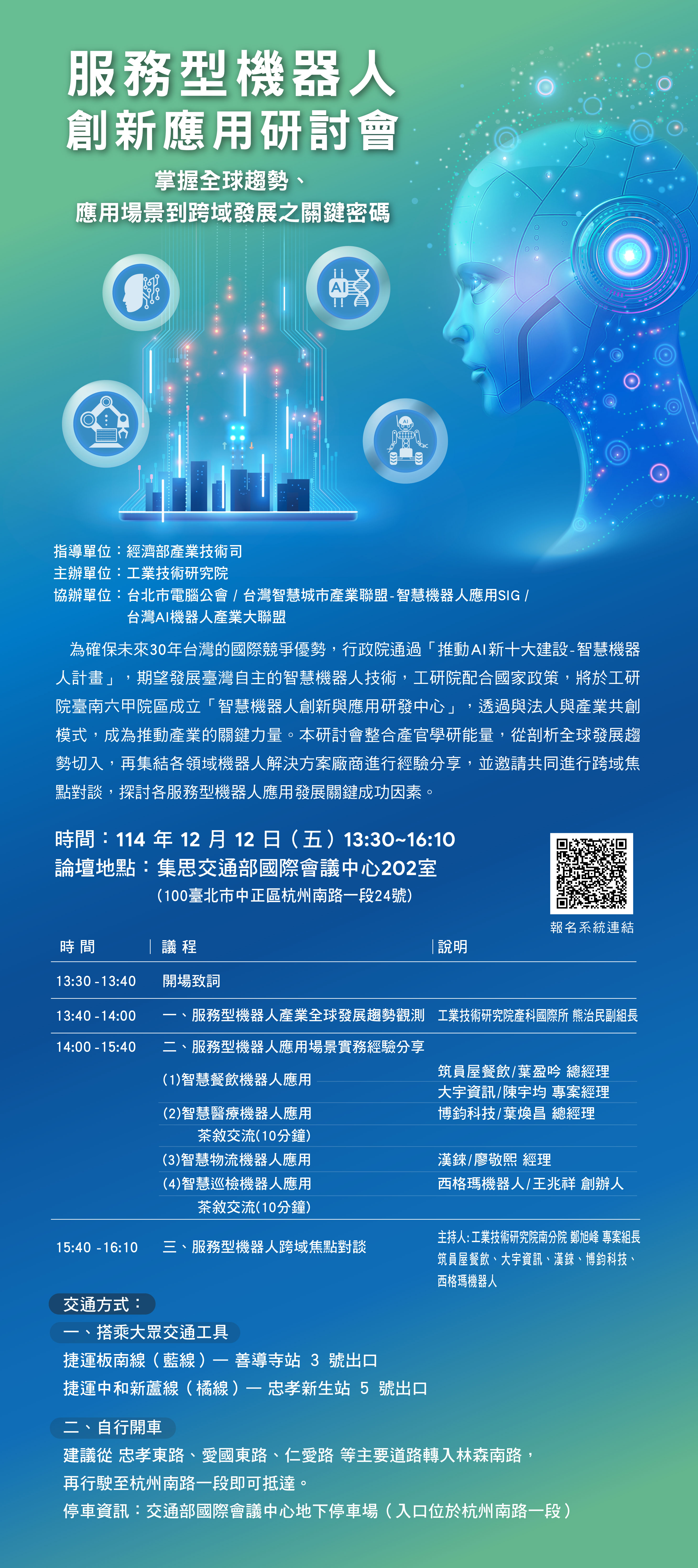 | 【資訊分享】服務型機器人創新應用研討會-掌握全球趨勢、應用場景到跨域發展之關鍵密碼 | 2025-12-07 |